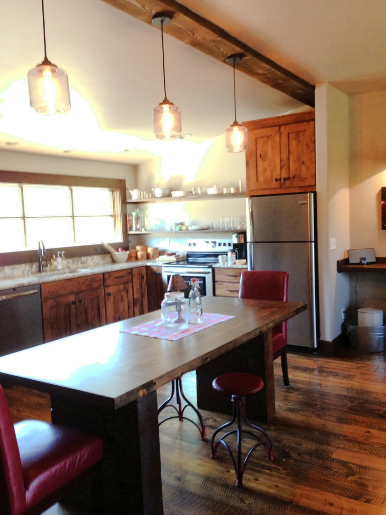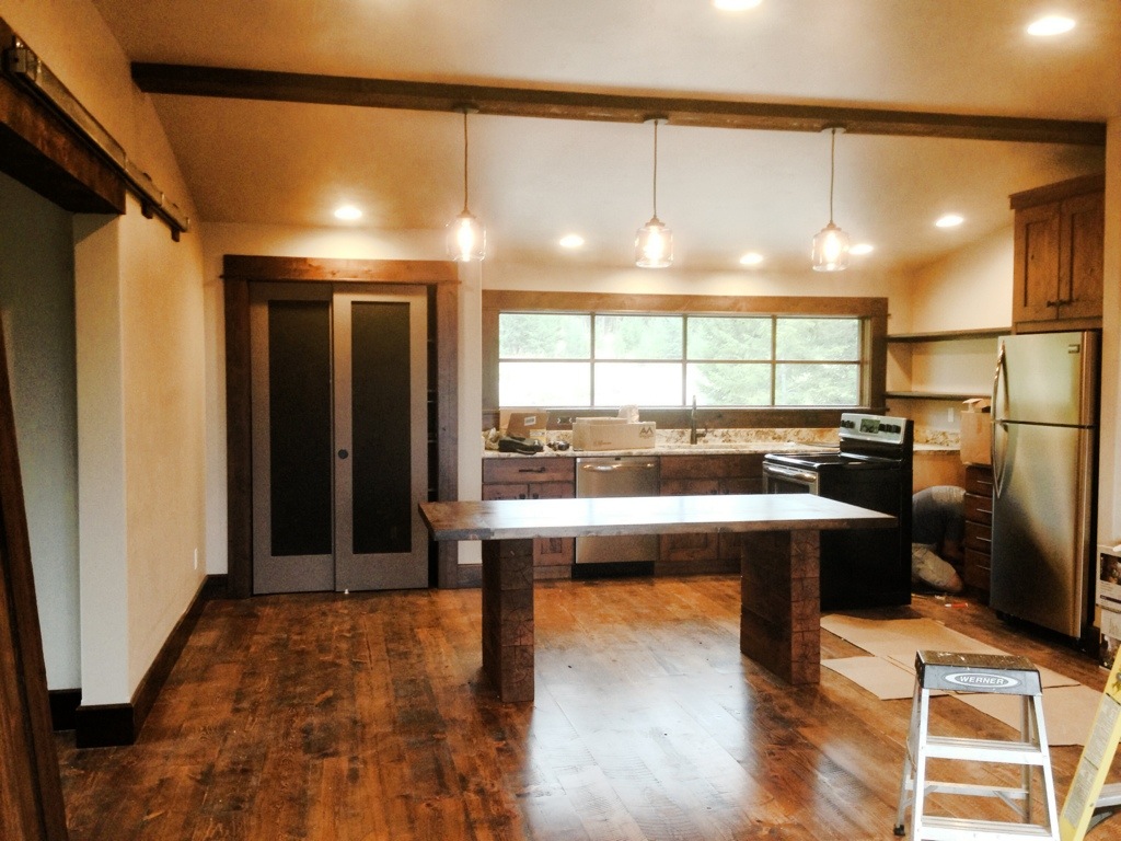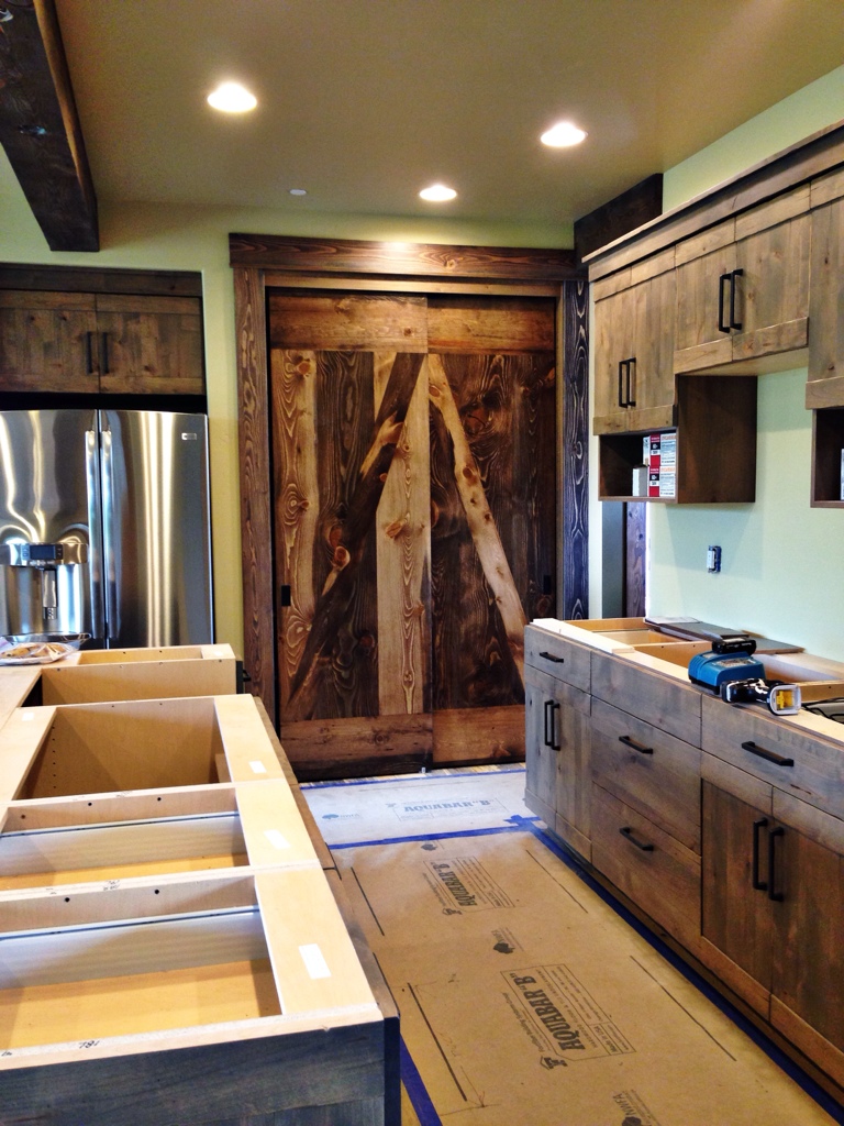 Sliding barn doors are a feature we like to work into our homes. In this case, we didn’t have quite the right spot, so we modified the concept for the panty. Here’s a shot of our custom 8 foot beetle kill blue pine bi-pass doors from RBM, and they look perfect in the kitchen of our East Rim house. We are in the last 10 days of this project, more photos to come!