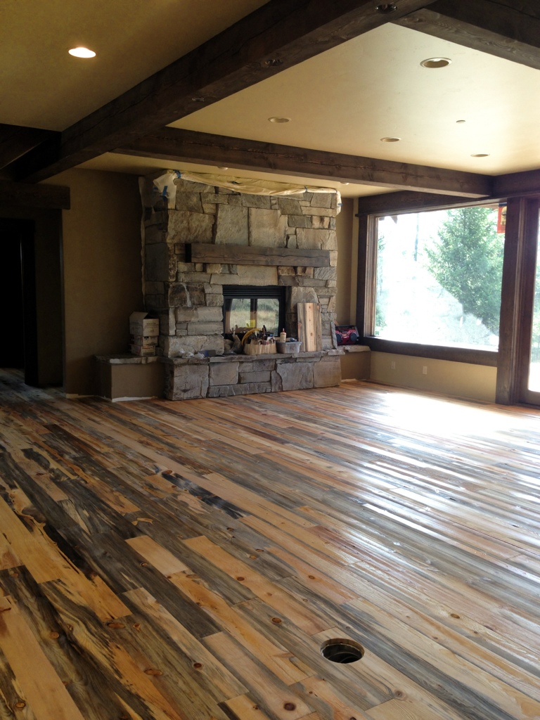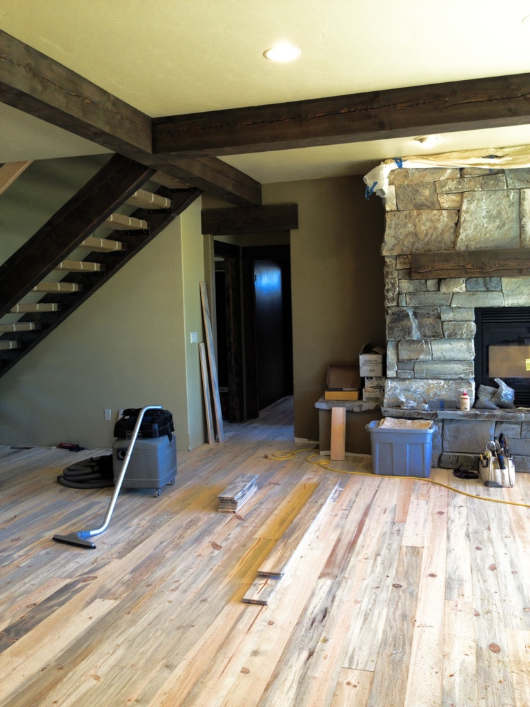 For everyone who was through our parade house last weekend and saw our circle sawn fir/larch floor, I am excited to show you a different option. We are just finishing laying this 6″ beetle kill blue pine floors, with a wire brushed texture from RBM. I can’t wait to see this floor stained (a barn wood gray shade) look for some photos next week!